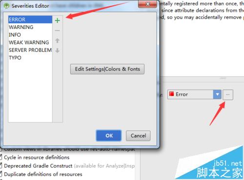 6、也可以進行添加更多,進入到severities Editor,來進行添加錯誤的等級的分類,在Edit settings|colors&fonts中選擇不同顏色。