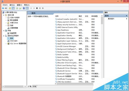 3、打開后進入計算機管理后臺,在服務和應用程序中找到服務選項,單擊后顯示如下界面。