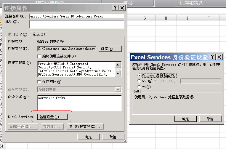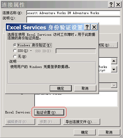 在連接屬性中點擊“驗證設置”,可看到Excel Services的驗證有三種。