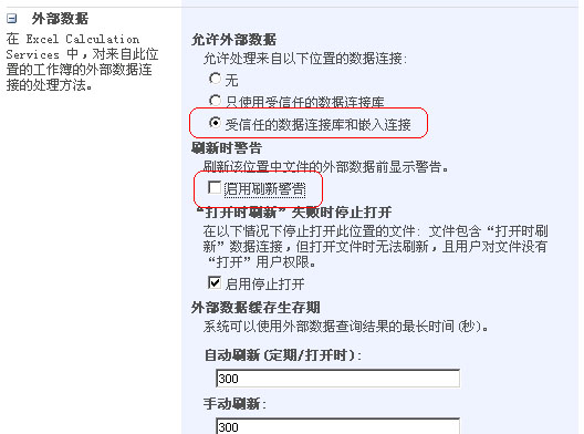 在允許外部數據這里是設置可以使用何種連接方式,受信任的數據連接庫是指在庫中的外部ODC文件。這里選中“受信任的數據連接庫和嵌入連接”表明可以在Excel中使用外部ODC連接和嵌入連接。順便取消選中“啟用刷新警告”。修改后選確定。