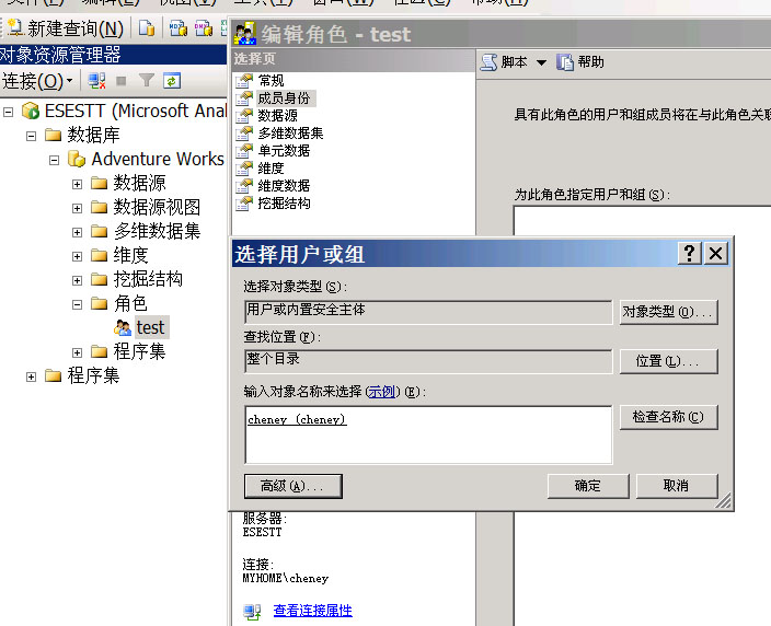 這里的esestt是我的運行SSAS機器名稱,myhome.cheney是域名,myhome/administrator是SQL Server運行帳戶。