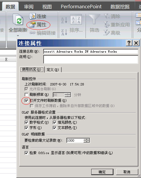 點擊數據連接屬性,在“使用狀況”中可以設定Excel中數據刷新頻率,以及是否從OLAP數據庫中讀取數據顏色、格式等屬性。