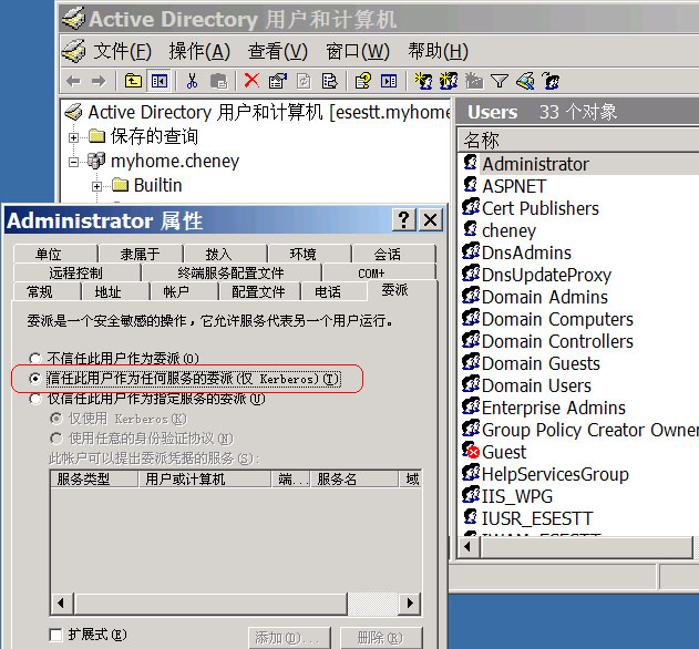 5 在AD用戶的管理窗口,為MOSS和SSAS帳戶啟用委托,我這里的帳戶都是Administrator,所以只為administrator啟用委托即可。
