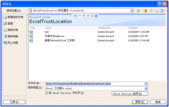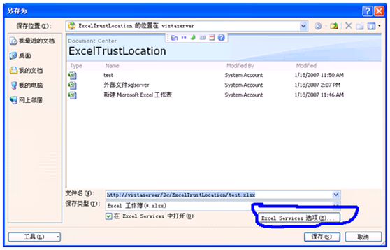 現(xiàn)在打開剛才創(chuàng)建的Excel文檔,選擇“發(fā)布”,進(jìn)入“另存為”窗體。我們可以看到,保存按鈕上方還有一個”Excel Services選項”按鈕