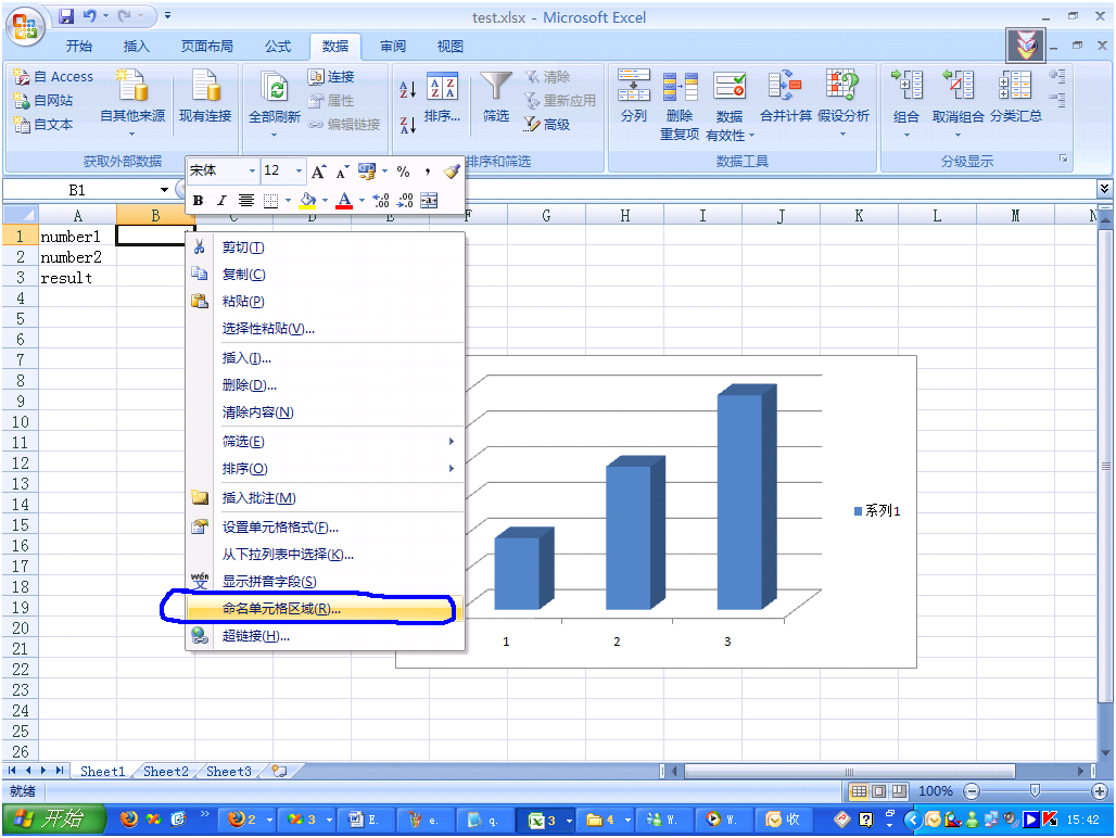 我們還需要為Excel中的單元格命名(麻煩,竟然不能使用默認(rèn)的名稱),返回到剛才的sheet中,右鍵點擊B1單元格,這時會出現(xiàn)菜單,選擇其中的“命名單元格區(qū)域”….