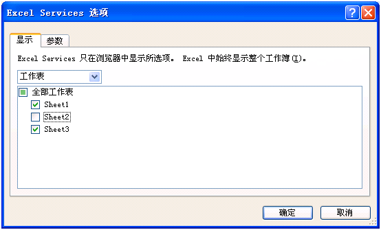點擊這個按鈕,這時我們看到“Excel Services選項”窗體中有兩個選項板。“顯示”選項板(第一個選項板)可以控制具體顯示哪一個sheet.在這里,我們鉤住sheet1和sheet3