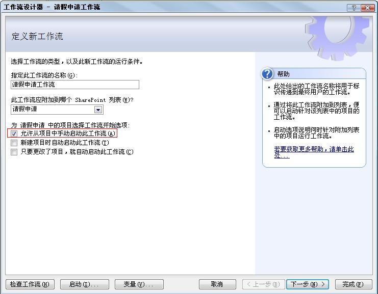為工作流起一個(gè)名字,然后將這個(gè)工作流添加到SharePoint中我們前面創(chuàng)建好的那個(gè)請(qǐng)假申請(qǐng)列表。這里我選擇的是手動(dòng)啟動(dòng)工作流,當(dāng)然也可以選擇自動(dòng)開啟。
