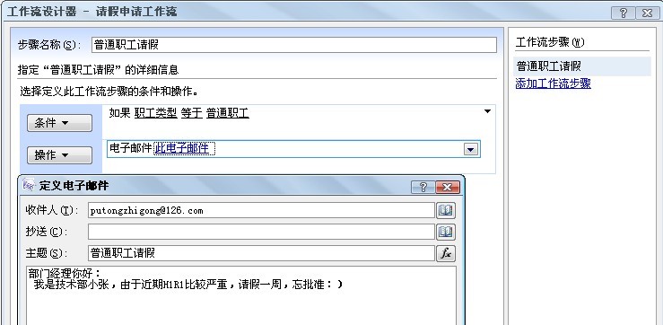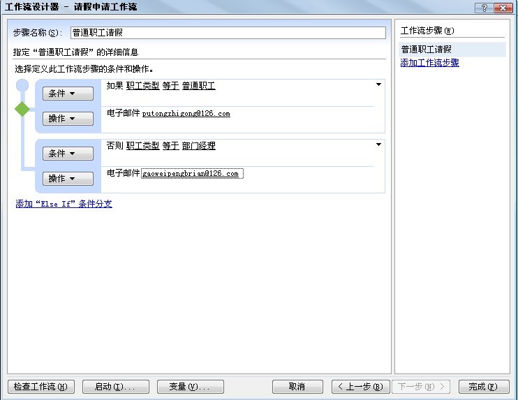 這里設(shè)想的工作流程就是:如果有普通員工請(qǐng)假,給部門經(jīng)理發(fā)郵件,如果有部門經(jīng)理請(qǐng)假,就向總經(jīng)理發(fā)郵件。點(diǎn)擊完成后就會(huì)將工作流添加到SharePoint中。