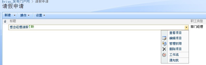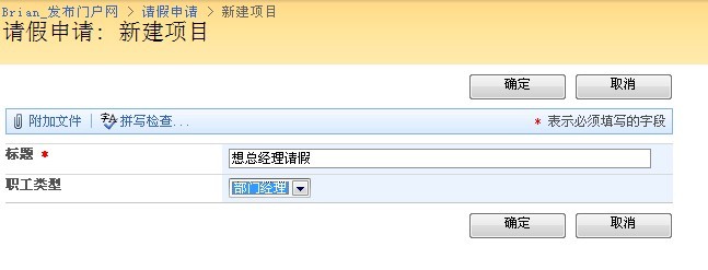 最后要做的就是測(cè)試下我們的工作流,回到SharePoint中的請(qǐng)假申請(qǐng)列表,新建一個(gè)項(xiàng)目: