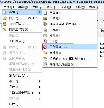 點(diǎn)擊確定,我們得準(zhǔn)備工作就完成了。下面我們利用SharePoint Desigener創(chuàng)建工作流,打開網(wǎng)站:新建---工作流