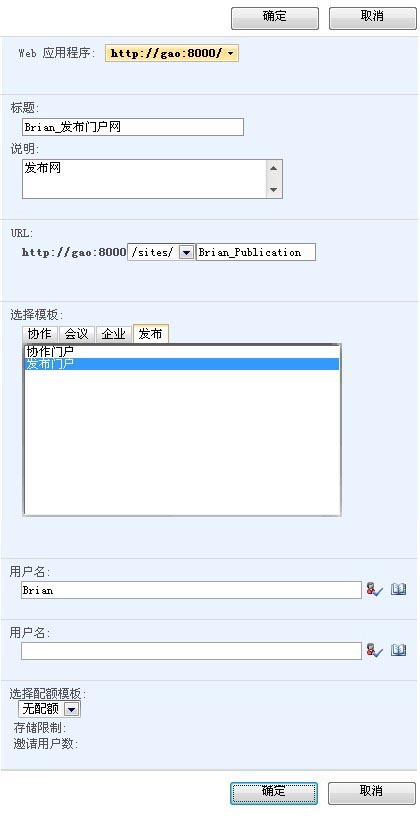 點擊“創建網站集”進入創建網站集的管理界面,SharePoint為我們提供了很多網站類型的模板,如發布網站,會議工作區....。根據自己的需求,選擇合適的網站類型。這里我們以發布門戶網站為例,進行網站配置: