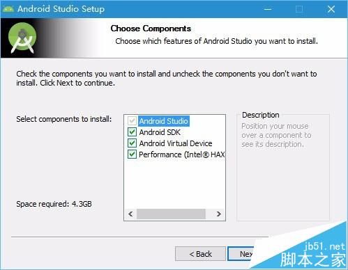 2、勾選安裝Android Studio、Android SDK和Android Virtual Device,然后Next下一步。