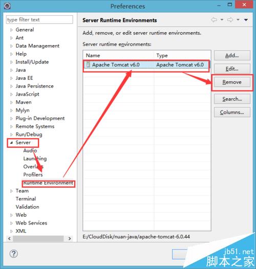 2、展開Server—>Runtime Environment,選中列表里對應的tomcat—>Remove(如這里的Apache Tomcat v6.0),點OK保存修改