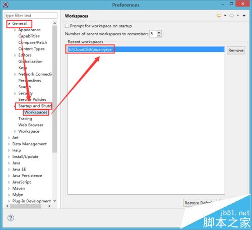4、如果用以上方法還是沒有辦法添加,那就接著往下。首先查看eclipse的工作空間,如果知道工作空間就可以跳過此步。打開Window—>Preferences—>General—>Startup and Shutdown—>Workspaces就能看到你的工作空間了。