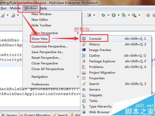 3、將鼠標放在Show View上在右側即可看到有一個Console控制臺,點擊選擇即可在界面上顯示控制臺。