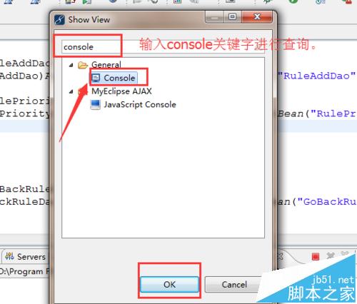 5、直接在輸入框中輸入console關鍵字進行查詢console控制臺所在的位置,選擇好之后,點擊OK保存設置。