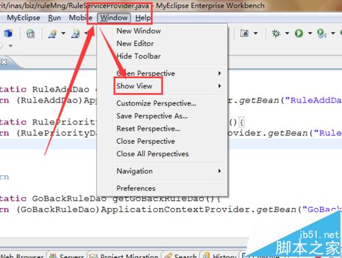 2、點擊eclipse頂部導航中的windows選項,選擇ShowView視圖。顯示視圖界面。