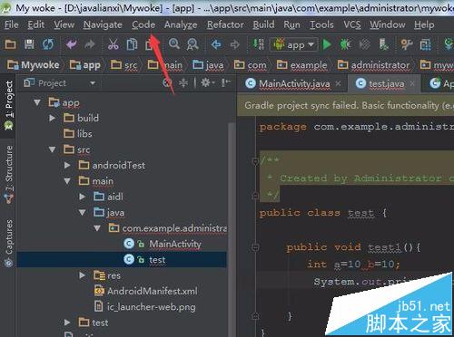 2、然后進(jìn)行點(diǎn)擊Android studio的菜單中的“code”的選項(xiàng)。