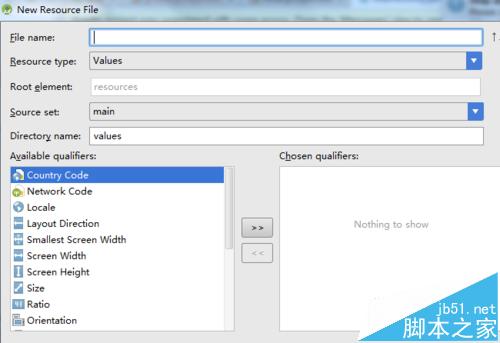 5、然后就會彈出了一個new resource file的選項,進入輸入一個file name的文件名,在available qualifiers的進行選擇layout direction進行點擊雙箭頭,然后就可以點擊”OK“。