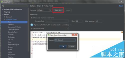 2、此時,需要通過點擊“Save as”來新建一個Scheme,新方案將以原方案為基礎修改為你喜歡的風格。包括字體、字體大小、行間距、代碼顏色等設置。按下ok后,是不是可以修改字體大小啦?