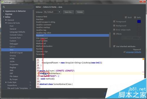 6、那么,Colors & Fonts>Java,點擊要修改顏色的代碼字段,則對應的代碼字段類型將被選擇,如代碼字段“interface”對應“keyword”類型,右邊即是對“keyword”類型字段的指定設置。