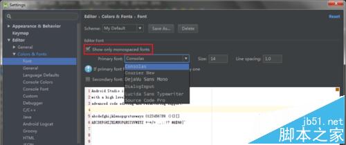 1、首先在菜單欄找到File菜單,然后File>Settings>Editor>Colors & Fonts>Font,準備修改字體。不幸的是,Android Studio自帶的Scheme是不允許修改字體的,如下圖所示。