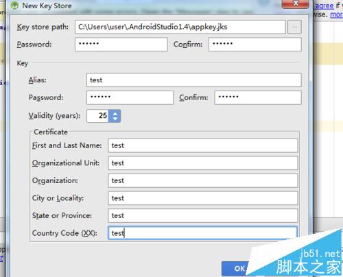 4、進(jìn)入到new key store的界面中,根據(jù)界面中提示信息輸入內(nèi)容信息,輸入完成之后點(diǎn)擊“ok”。