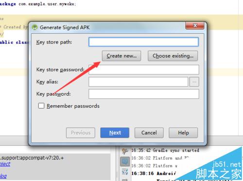 2、進(jìn)入到generate signed apk中界面框中,因第一次對(duì)apk的簽名,就需要先創(chuàng)建簽名文件鑰匙,點(diǎn)擊”create new“的按鈕。