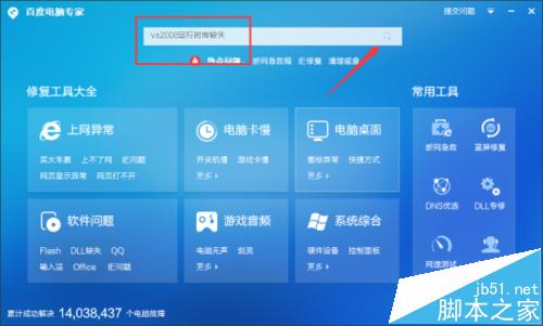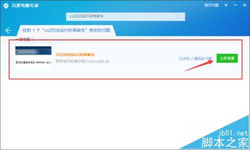 4、打開百度電腦專家窗口,在搜索框中輸入“vs2008運行時庫缺失”,然后在點擊“搜索”按鈕。如圖所示