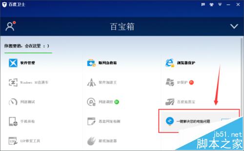 2、在打開的百度衛士軟件界面,點擊右側“百寶箱”按鈕打開它。如圖所示;