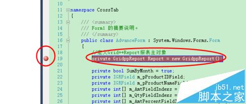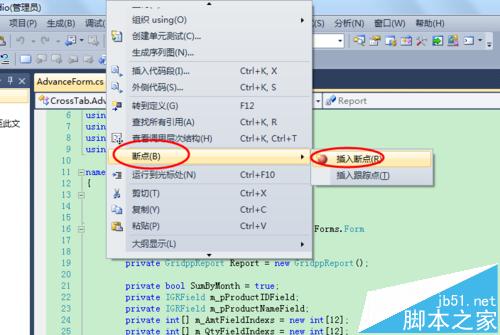 1、用vs2010打開一個程序(此處為CrossTab),將光標定位在要插入斷點的地方(此處為CrossTab下的AdvanceForm.cs的第19行處):