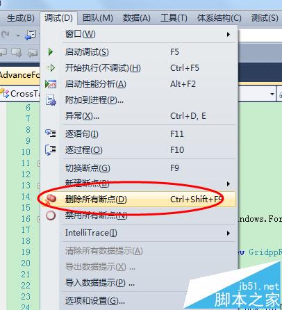 1、可通過第三步中的方法進行斷點的切換(即取消),若程序中有多個斷點,要取消全部斷點,可以在”調試“菜單下看到”刪除所有斷點“,點擊”刪除所有斷點“(或使用快捷鍵shift+ctrl+F9)即可將所有斷點刪除。