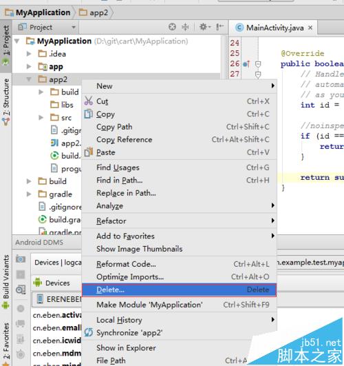 4、如下圖,在項目上點擊右鍵,delete就可以把module刪除掉了
