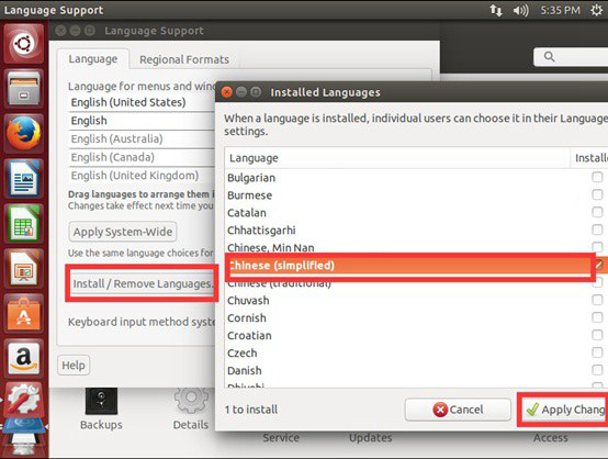 四、完成設置后點擊【install/remove language】,在彈出的窗口找到【chinese(simplified)】,最后點擊【apply change】,如下圖所示。
