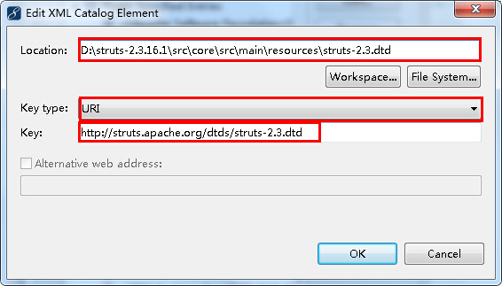 選擇“File System”按鈕,找到dtd文件的位置,“E:/struts-2.3.4.1/src/core/src/main/resources”,在這個路徑下邊有一個“struts-2.3.dtd”的文件,這就是我們要找的文件,所以選中該文件之后,location的內容為:“E:/struts-2.3.4.1/src/core/src/main/resources/struts-2.3.dtd”,接下來在“Key type”的地方選擇類型為“URI”,在“Key”的地方輸入“http://struts.apache.org/dtds/struts-2.3.dtd”,這句話可以上該dtd文件DOCTYPE中找到。如圖所示