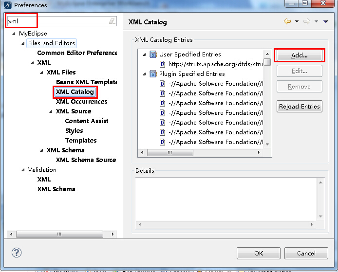 2、在打開的“Preferences”界面中搜索“xml”,選擇“XML Catalog”選項,然后選擇右邊的“Add...”按鈕