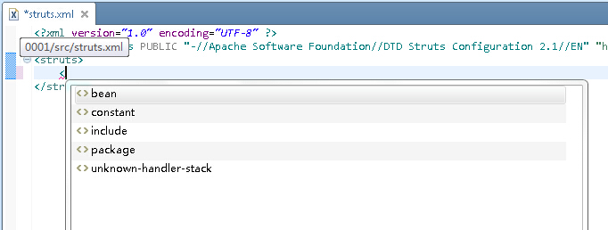 這樣當我們在struts.xml文件中輸入“<”便會出現提示了,如圖所示: