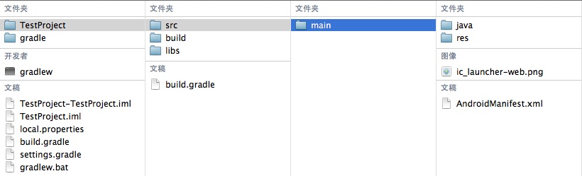 工程目錄上的區別,在Eclipse中src部分一般是java文件,res部分是資源文件,包括布局文件和多媒體資源等。在Android Studio中,可以看下圖的目錄結構:
