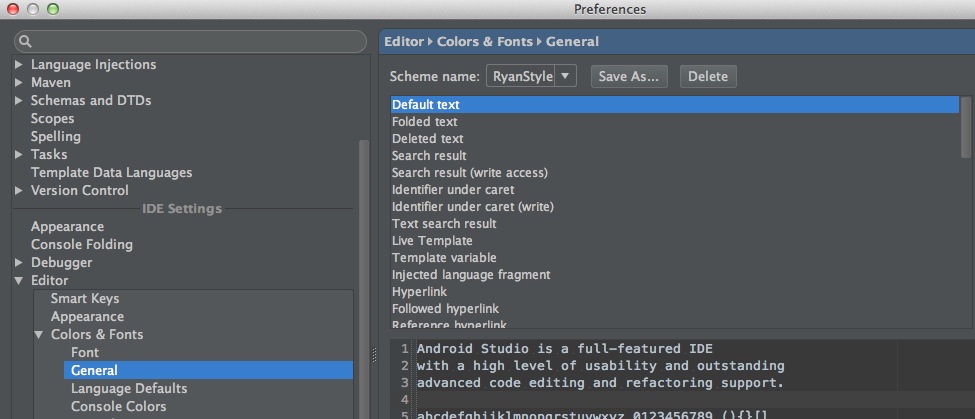 最后需要說明的是,大家看到我的主界面是暗色風格,和Google演示的是一樣的風格,大家第一次使用打開的是默認風格(亮色),如果想要修改的話,進入Preferences(按Command+,)到IDE Settings下選擇Colors&font并設置Schema name為Darcula就可以設置成暗色風格,如果需要自己定義樣式,比如字體大小顏色等,可以新建一個Schema來自己定義