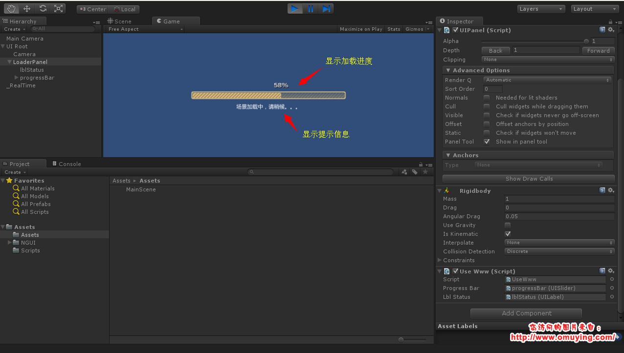 // 加載場景使用 WWW.LoadFromCacheOrDownload,函數(shù),這樣加載完成才能使用 Application.LoadLevel 或者 Application.LoadLevelAsync