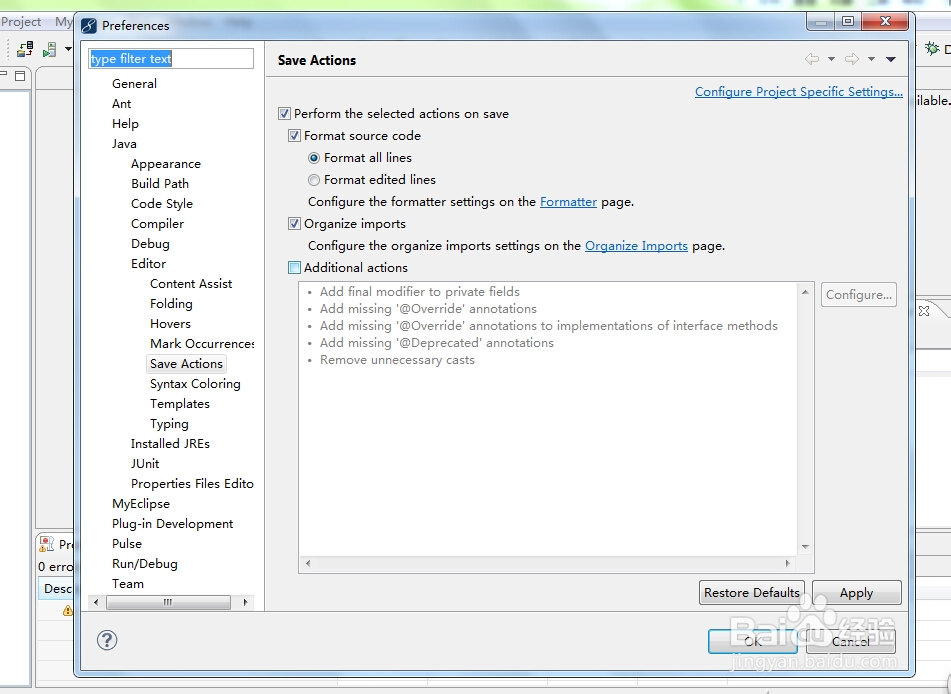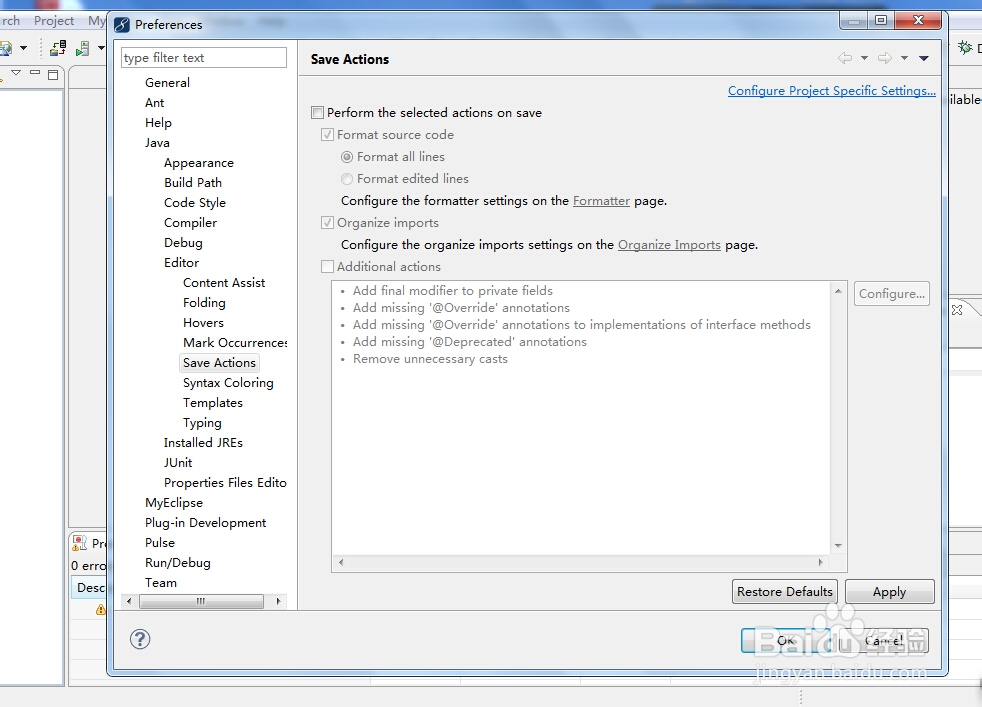 2、在彈出的“Preference(首選項(xiàng))”窗口界面,找到左側(cè)java導(dǎo)航 ---->“editor ”----->“save actions”。