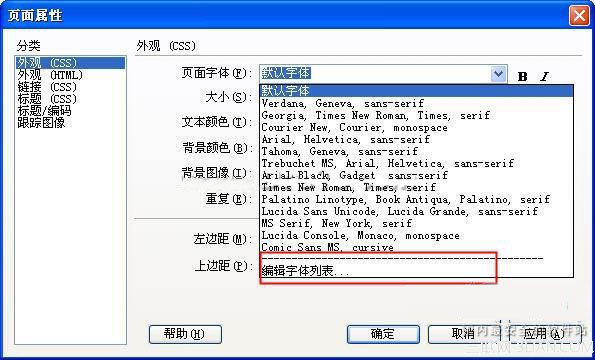 在“頁面屬性”窗口中,我們可以對字體進行顏色、大小、字體等修改,如果你在字體下拉菜單中找不到你想要的字體樣式,可以點擊“編輯字體列表”,如下圖所示。