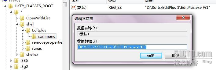 2、在 shell 下新建項 "editplus";修改右側(cè)默認值為用EDITPLUS打開,