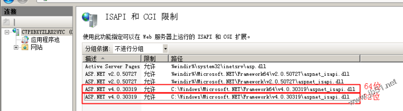 3. 設置IIS的“ISAPI和CGI限制”中的“ASP.NET v4.0.0.30319”為允許,如下圖所示:
