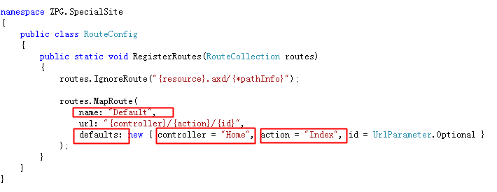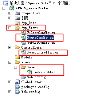 2.由于mvc4.0在創建項目后,默認在項目下的App_Start文件夾中的文件“RouteConfig.cs”里自動配置了“默認路由”為HomeController控制器下的Index方法(ActionResult),所以不需要在站點默認文檔里配置默認文檔名字,該站點會自動根據mvc的路由機制找到默認需要顯示的視圖文件。如下圖: