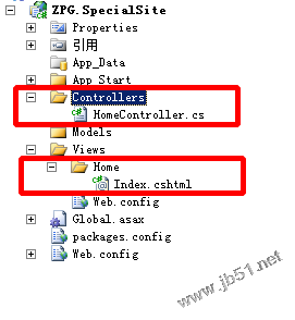 為了測試需要,在項目ZPG.SpecialSite中創建控制器HomeController,并創建視圖Index.cshtml,如下圖: