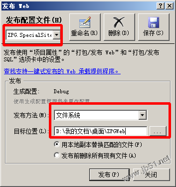 2.在“發布web”對話框中進行設置,配置文件名稱默認為“配置文件1”可以修改為需要的名字,以便識別,也可以不改。發布方法選擇“文件系統”,目標位置處選一個文件夾用于存放將要發布的整個站點所有文件,這里我選擇為“D:/我的文檔/桌面/ZPGWeb”,然后點擊“發布”按鈕。如圖: