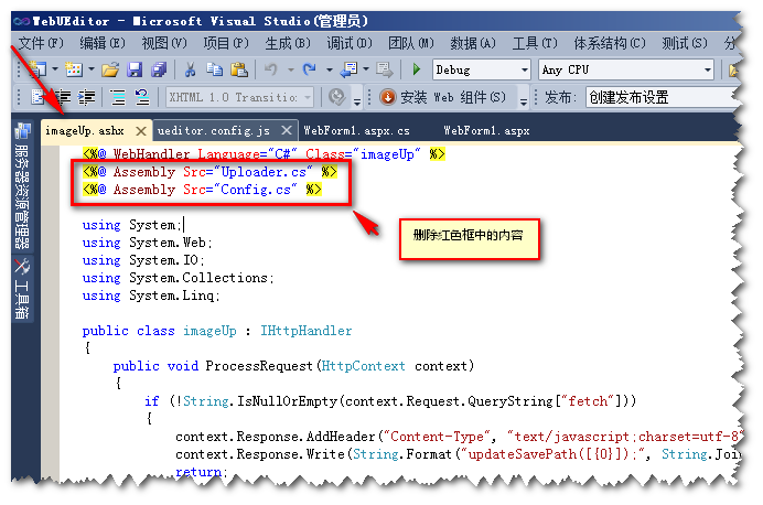 6.不要氣餒,我們繼續(xù),打開net文件下的imageUp.ashx,將下圖紅框中的內(nèi)容給刪除,我們上傳不成功全是這兩行代碼在搗鬼。