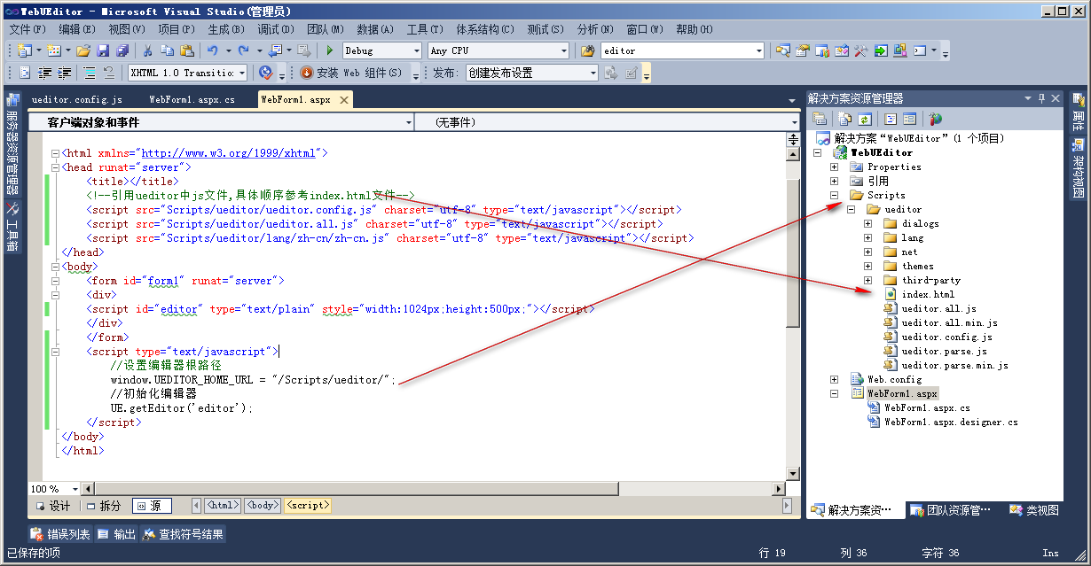 2.打開vs2010創(chuàng)建一個空的web應(yīng)用程序,并將我們下載的UEditor,解壓放到需要的地方,然后引用相關(guān)資源到頁面上,我的如下: