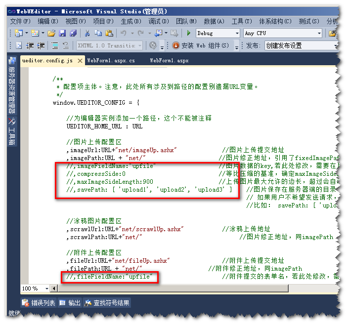 4.打開ueditor.config.js,然后將下圖中紅框中的代碼取消注釋。注意第二個紅框是和附件上傳有關(guān),為了方便,這里一并取消注釋。
